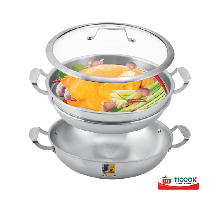 | CHẢO HẤP INOX 304 BA LỚP NẮP KÍNH ĐÁY TỪ TICOOK 32cm |